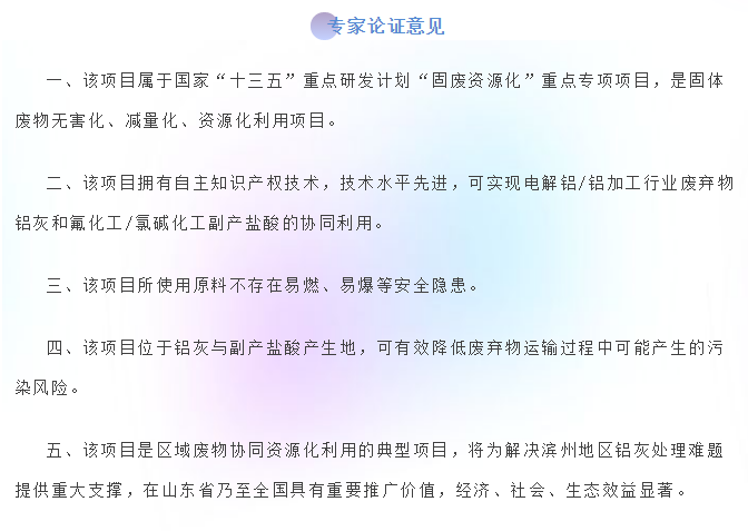 與會(huì)專(zhuān)家聽(tīng)取了建設(shè)企業(yè)及技術(shù)團(tuán)隊(duì)對(duì)技術(shù)總體情況的匯報(bào)。在充分質(zhì)詢(xún)、討論后,專(zhuān)家一致認(rèn)為,本項(xiàng)目技術(shù)路線(xiàn)合理、前期基礎(chǔ)扎實(shí),可實(shí)現(xiàn)電解鋁/鋁加工鋁灰和副產(chǎn)鹽酸的協(xié)同利用,屬典型的資源循環(huán)利用項(xiàng)目。